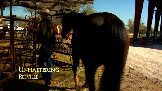 Buck demonstrates how to work with a horse that rushes to go out the gate.